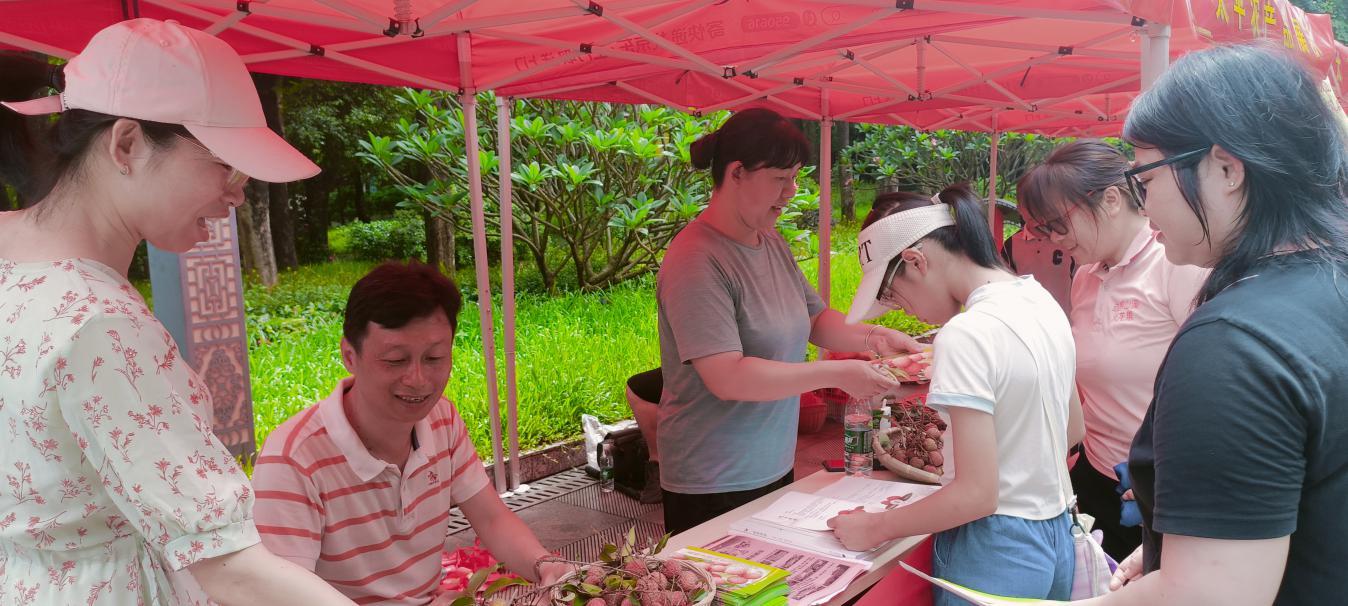 旁边的荔枝科普区同样人气高涨,工作人员热情介绍着井岗红糯、钱岗糯米糍等特色品种,游客们撑着伞,一边躲雨一边品尝当季最新鲜的荔枝。